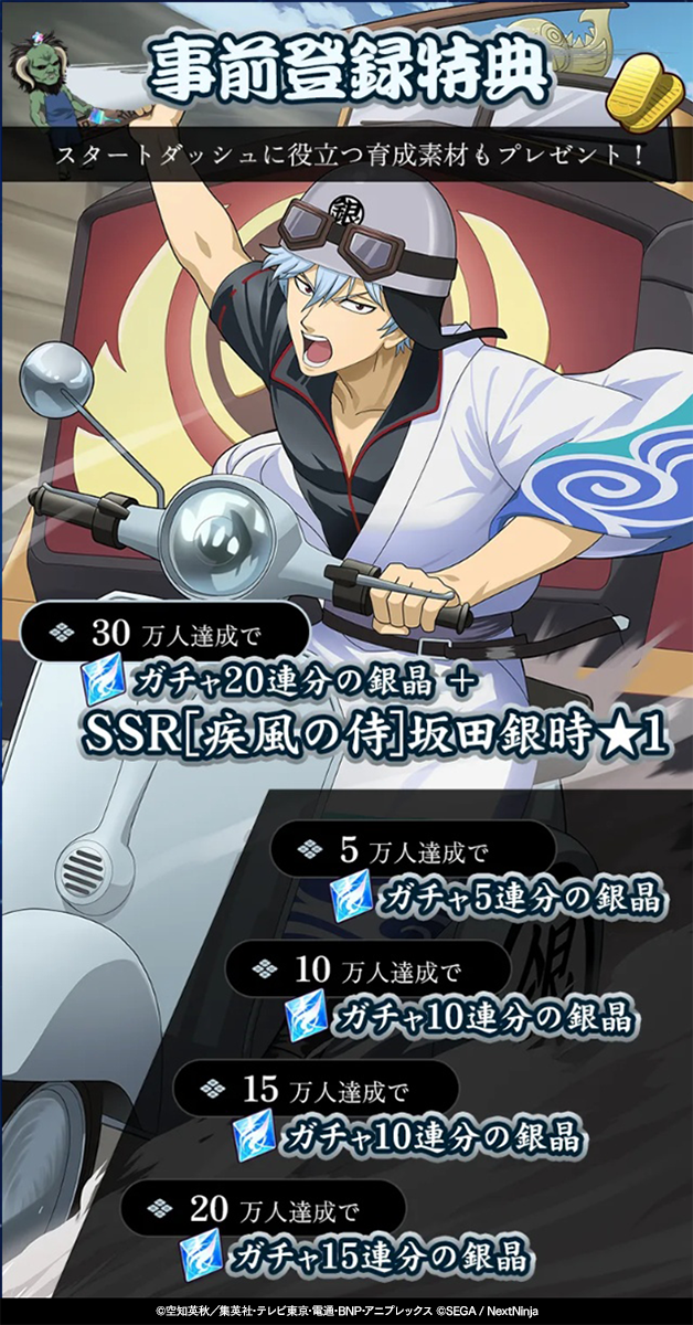 本日より、『銀魂 すまほ ばとるくろにくる』の公式サイト、SNSを公開いたしました。あわせて、事前登録者数に応じてもらえる特典が豪華になるキャンペーンを開催いたします。事前登録者数が30万人を突破すると、ゲーム開始時に合計60連分のガチャが回せるアイテム「銀晶」をプレゼント! さらに特典としてSSRキャラクター「[疾風の侍]坂田銀時☆1」を獲得することができます。特典は、正式サービスイン時にすべてのユーザーにプレゼントされます。